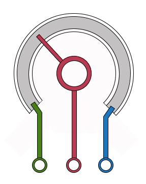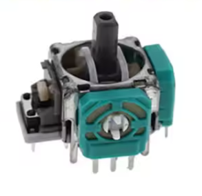 Links erkennt man einen Schalter, der auslöst wenn man den Stick drückt. Die grünen Teile sind Potentiometer (veränderbare Widerstände), je eins für links/rechts und eins für hoch/runter. Ein Potentiometer ist ein veränderbarer Widerstand, an dem Spannung über den kompletten Bereich anliegt und dann mit einem Mittelabgriff die Position des Schleifers ausgelesen wird. Nach dem Prinzip des Spannungsteilers (Physik 8. Klasse) ändert sich die Spannung am Schleifer je nach Position auf dem Schleifring.